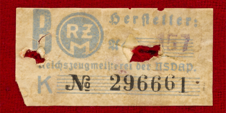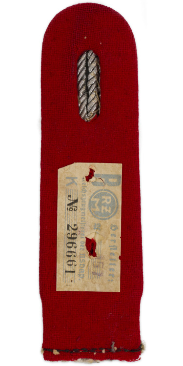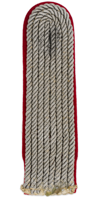PHYSICAL DESCRIPTION: Second pattern (1939) shoulder board comprised of four doubled cords in silver-white rayon upon a stiff, crimson wool base, which extends along their edges to form visible piping. This pattern was that used by the ranks of "Sturmführer" (Second Lieutenant) to "Hauptsturmführer" (Captain) from their introduction until the end of the war. Original RZM tag.