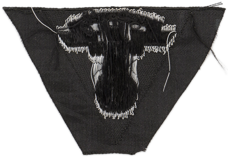 PHYSICAL DESCRIPTION: A machine woven, first pattern (1935-39) NSKK eagle and swastika, with a banner arching above upon which is "N.S.K.K.," all in silver wire with black accents, on a black, inverted triangular rayon base. The insignia is still on its original black rayon factory roll. The color black signified wear by Motor-Brigade Westfalen or Motor-Gruppe Neiderrhein. Mint unissued.