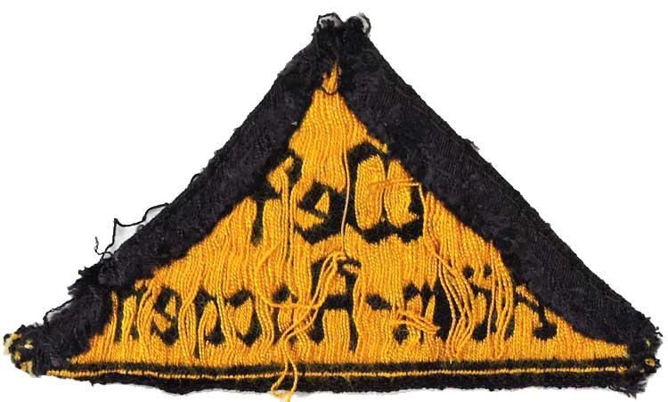 PHYSICAL DESCRIPTION: Woven black rayon construction isosceles triangle features machine woven Gothic script in two lines, "West Köln-Aachen", in golden yellow threads. The triangle also has a narrow machine woven golden yellow border stripe near the outside edges. The triangle has a small section of its original black rayon factory roll folded and machine stitched to the reverse.