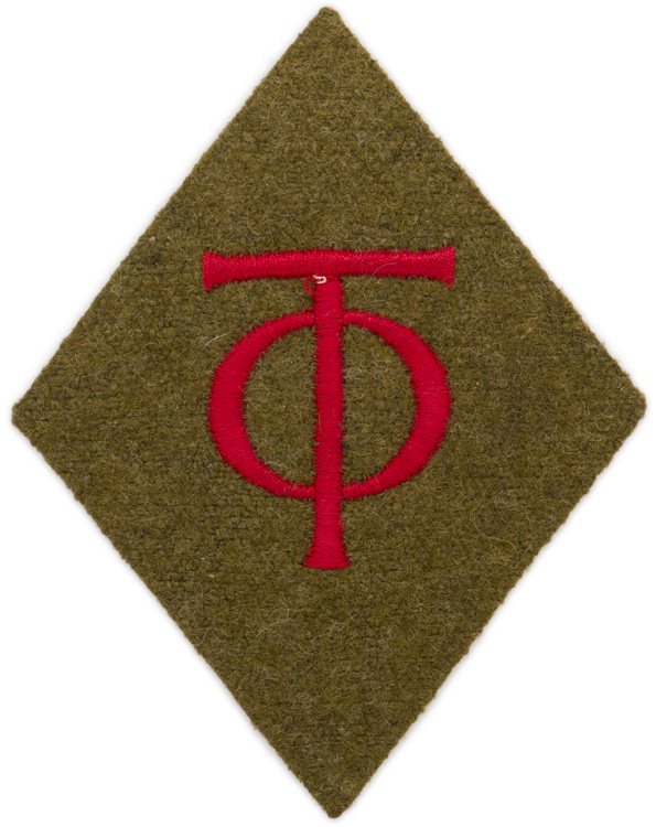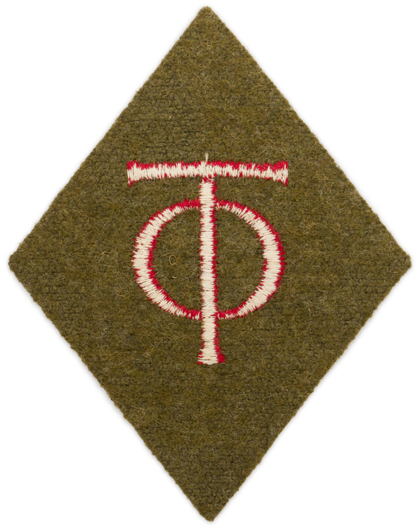 PHYSICAL DESCRIPTION: Diamond-shaped collar tab, 70mm wide x 90mm tall. The "OT" monogram machine embroidered in red on a olive drab wool backing. Very nice unissued example.