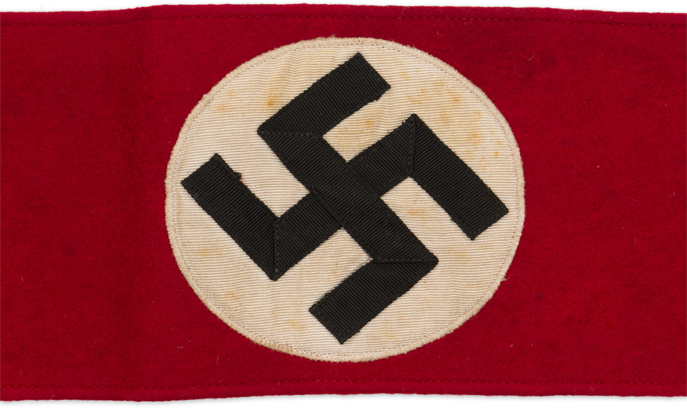 PHYSICAL DESCRIPTION: Red wool armband, upon which is sewn a white disk, with a separate black mobile swastika sewn to it. Couple of small moth holes. Nice early production example,