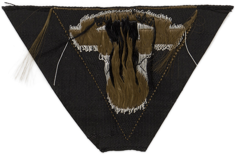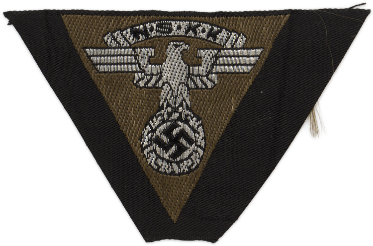 PHYSICAL DESCRIPTION: A machine woven, first pattern (1935-39) NSKK eagle and swastika, with a banner arching above upon which is "N.S.K.K.," all in silver wire with black accents, on a bark brown, inverted triangular rayon base. The insignia is still on its original black rayon factory roll. The color signified wear by Motor-Brigade Westmark or Motor-Gruppe Niedersachsen.