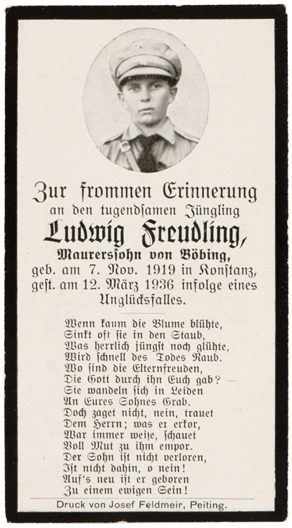 A double sided remembrance card for Ludwig Freudling dolf Wagner who at the age of 20 died in an accident.