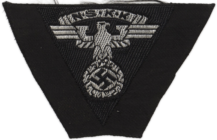 PHYSICAL DESCRIPTION: A machine woven, first pattern (1935-39) NSKK eagle and swastika, with a banner arching above upon which is "N.S.K.K.," all in silver wire with black accents, on a black, inverted triangular rayon base. The insignia is still on its original black rayon factory roll. The color black signified wear by Motor-Brigade Westfalen or Motor-Gruppe Neiderrhein. Mint unissued.