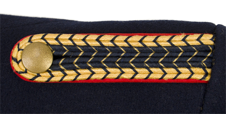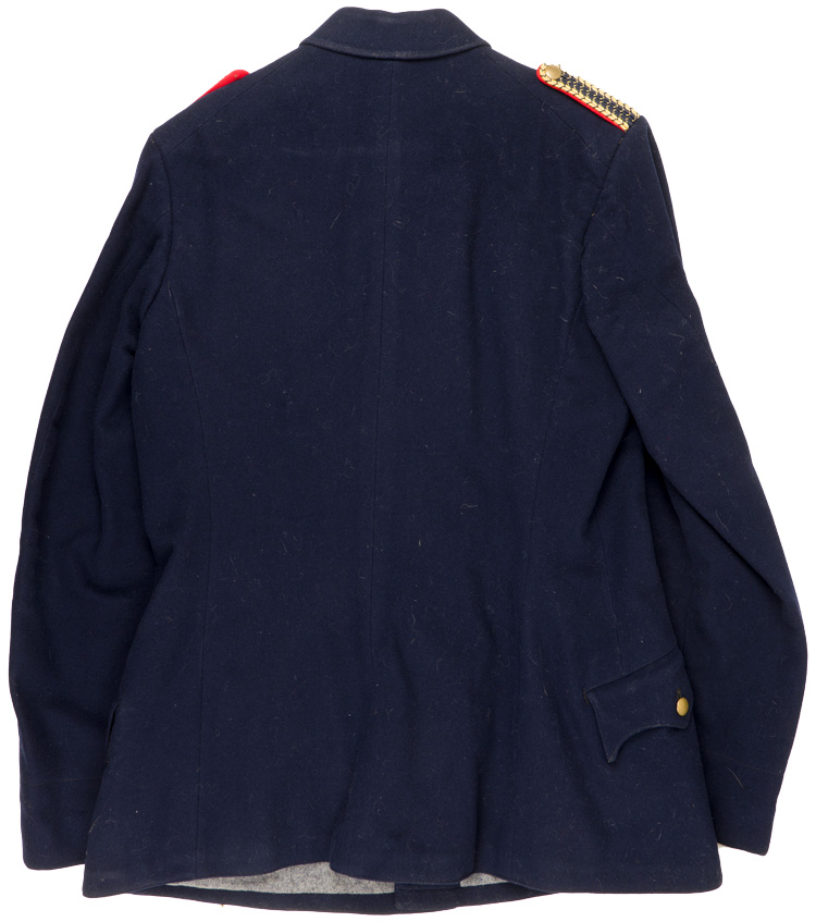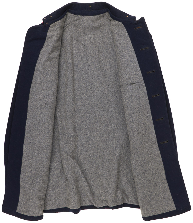 PHYSICAL DESCRIPTION: Nice quality, deep navy blue doeskin wool tunic that features a six button front closure with dual hooks at the collar. To the inside of the collar are three brass studs for a removable collar. A pair of matching collar tabs and sewn in shoulder boards. Collar tabs have been replaced at some point, shoulder boards look to be original stitching. Tunic has two pleated patch breast pockets and two slightly diagonally angled slash hip pockets, all with scalloped button down flaps. Buttons are complete and most look to be original stitching as well. The chest measures approximately 40".