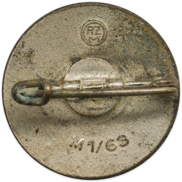 PHYSICAL DESCRIPTION: A 24mm diameter, die struck metal and painted NSDAP member’s badge. The badge features a red outer border, edged in silver, with the silver script, "National-Sozialistische-D.A.P.," encompassing a white field with a black mobile swastika, also edged in silver. To the reverse is crimped a horizontal pin-back device, above which is embossed the "RZM" logo, and beneath which is embossed the manufacturer’s code, "M1/63" for Steinhauer & Lück, Lüdenscheid.
