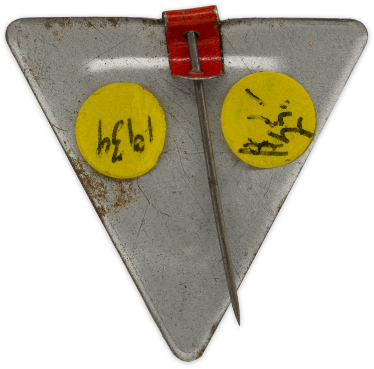 An approximately 3cm x 3cm, stamped alloy badge in orange and white enamel. The badge depicts the insignia of the NS Hago to its center, with the surrounding text, ‘2. Arbeitsschlacht 1934' and ‘Der Deutsche Kauft Im Deutschen Geschäst’ (The German buys in German shops). Unmarked and complete with pin back device