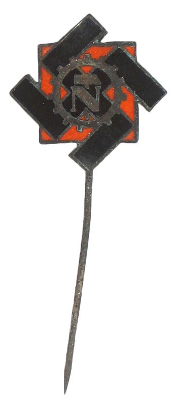 PHYSICAL DESCRIPTION: A 22mm alloy and enamel lapel pin in the form of a black mobile swastika, on a red square base, with a fifteen cogged wheel to the center of the swastika, enclosing a stylized "TN". To the reverse is the 45mm rifled stick pin, above which is embossed "Ges. Gesch." (patent pending). Membership number is stamped below. Scarce.