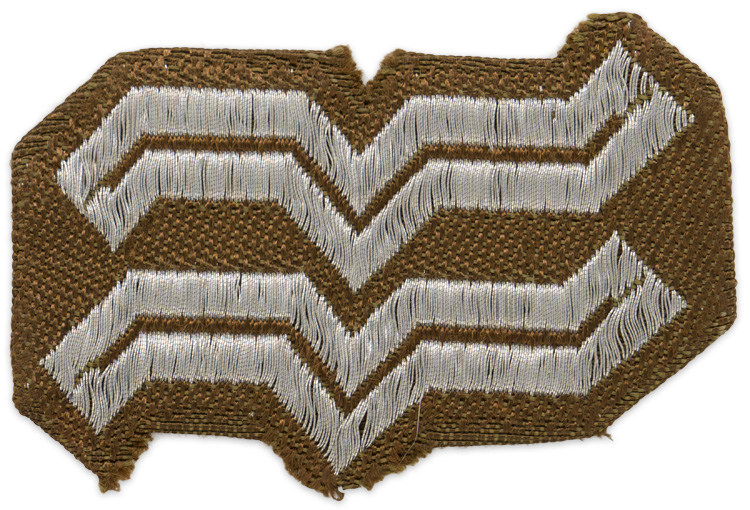 PHYSICAL DESCRIPTION: A third pattern (1943) right collar patch, in the form of two, machine woven angular bars, in silver-grey, on a medium brown rayon base. The edges of the base have been folded inwards to its featureless reverse. Some light wear may be seen to its edges, perhaps where it was removed from a uniform, and there is very light age soiling throughout. The mirror image of this would have been worn on the left collar of the tunic or greatcoat, and together they were known as "Wehrbau-Abzeichen" (Defence Construction Badges). Worn by the ranks of "OT-Oberbauführer," "OT-Oberfrontführer," and "OT-Oberarzt."