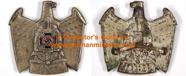 PHYSICAL DESCRIPTION: A stamped alloy visor cap badge, approximately 47mm square, in the form of a stylized eagle with down-swept wings, clutching "NSKOV" in its talons, and with that organization’s emblem superimposed to its breast. The emblem is comprised of a black mobile swastika within a circle bordered in red, the circle set against a black Iron Cross, and the Iron Cross set against a vertical sword, which has an oval oak leaf wreath surrounding it. All three original pins complete. Very nice example.