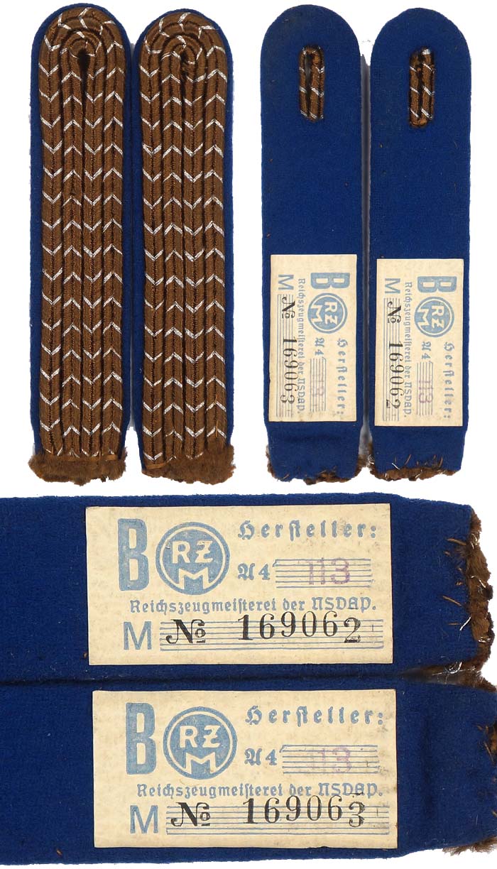 PHYSICAL DESCRIPTION: Second pattern (1939) shoulder boards. The upper surface of the boards are comprised of dual rows of doubled brown-colored cord, segmented with narrow silver-aluminum chevrons, as worn by all enlisted and non-commissioned officer ranks. Blue wool backing for medical. Complete with original RZM tags.