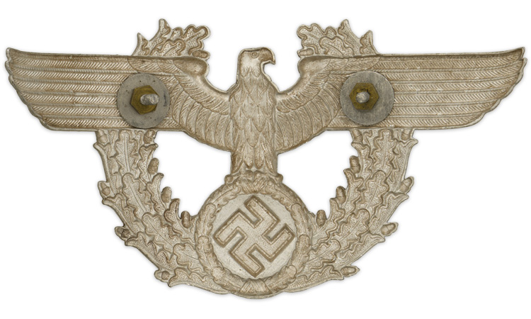 PHYSICAL DESCRIPTION: Second pattern, (Circa June 1936-May 1945), single piece, silver washed, die stamped aluminum, construction, right facing eagle features out-stretched wings, clutching a wreathed, canted swastika in it’s talons and is superimposed on a vertically oval, opened top, oak-leaf wreath with the eagles wings extending beyond the outer edges of the wreath. The hollow backed reverse is a mirror image of the obverse and has both inset, soldered, screw threaded attachment prongs and nuts.