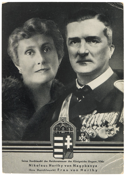 A black and white portrait, photograph postcard of Nikolaus Horthy von Nagybanya with his wife, that was mailed to an SS Scharführer who mentions that he had shaken Horthy’s hand in person. Posted and dated for 1938.