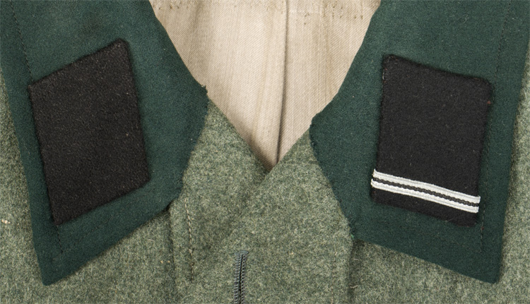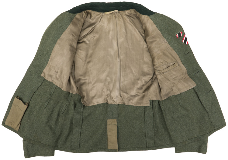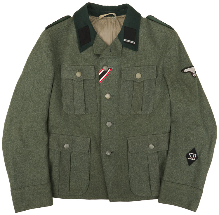 PHYSICAL DESCRIPTION: During World War II the Germans occupied Norway. In 1940, they converted Victoria Terrace into the headquarters for their Gestapo (Secret State Police) and Sicherheitsdienst (State Security for intelligence and covert operations). In 1942, the British tried unsuccessfully to destroy Victoria Terrasse in an aerial bombing called the Oslo Mosquito Raid. The building now serves as the Norwegian Ministry of Foreign Affairs. Vendor reports that this tunic was removed from the SD headquaters in Olso in 1945. It was found in stripped condition with no insignia. The previous owner has had original SD insignia restored to it. The tunic is an issue type (M43) that has been period privately tailored into its current configuration in 1943/44. Feldgrau wool construction tunic features a vertical, four button front (originally 5, but one removed to give it the open collar format). Also added at that time was the dark green collar and French style cuffs. Rbnr # and size marked. Nice original SD diamond, arm eagle, collar tabs, KVK2 ribbon and should boards have been restored to the tunic. Tunic is roughly a size 34/36" chest. Very interesting historical piece.