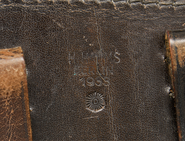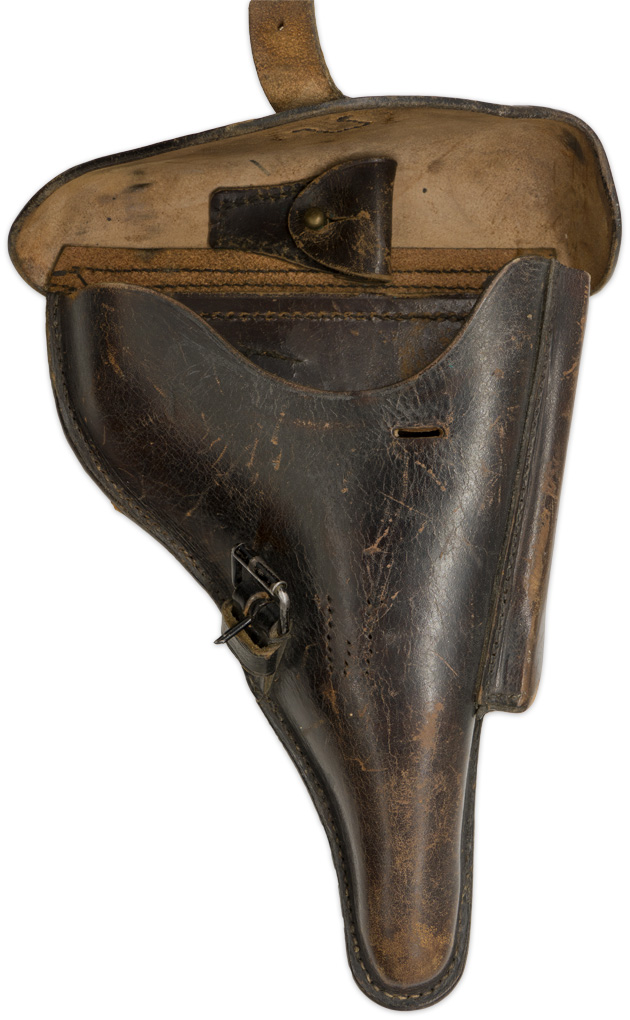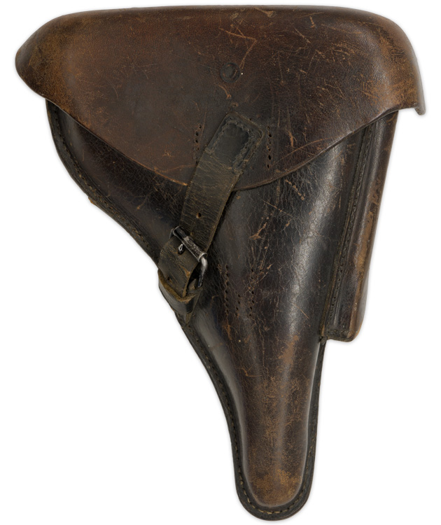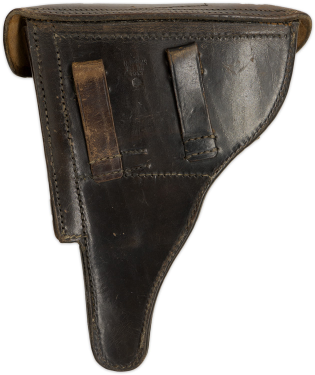 PHYSICAL DESCRIPTION: Molded, smooth, brown leather construction hard-shell holster for the standard 4" barrel P08 Luger pistol. The holster features a scalloped, fold back, top flap with a horizontal stitched hinge to the reverse. The Polizei strap configuration has been converted to an army pattern (front strap and buckle have been re-positioned). The holster has an extra magazine pocket stitched to the forward edge with a semi-circular cut-out to the top edge for ease of accessing the extra magazine. Quick release pull strap has been removed. The reverse of the holster has dual, slightly diagonally angled, belt loops stitched in place. Excellent Polizei markings.