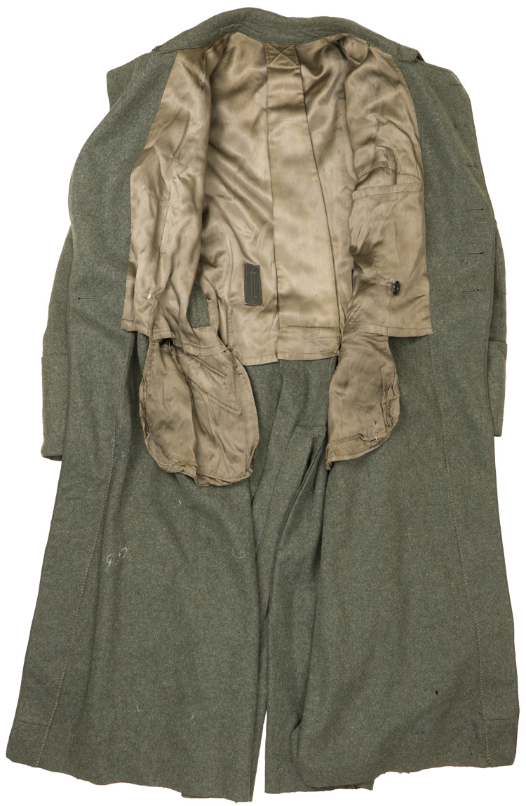 PHYSICAL DESCRIPTION: Heavy, field-grey wool/rayon blend, full length, double breasted style greatcoat that features dual, vertical, parallel, rows of six front closure buttons with corresponding button holes on the left front panel, and a single button hole on the right front panel. The greatcoat has small fold back lapels and a single metal hook and eye at the neck. The coat has two, diagonally angled, slash hip pockets with straight edged flaps. To the upper left sleeve is a machine woven SS sleeve eagle which is machine sewn on. Only portions of the eagles wings now remain. The reverse of the surcoat has a central, vertical tail skirt vent with a four button closure. The shoulder strap fabric retaining loops and buttons are intact. The coat has a large, field-grey, lay down collar with a single button and an extended field-grey wool tab under the left side and a single corresponding button under the right side for a secure neck closure in inclement weather. The collar has no collar tabs as regulations of June 1ST 1942, abolished them for wear by enlisted ranks on the greatcoat. Buttons are a combination of original and replaced stitching. Coat has it original size and makers markings. Roughly a size 36" chest. A few scattered moth holes. Shows the expected period use and wear but overall nice condition.