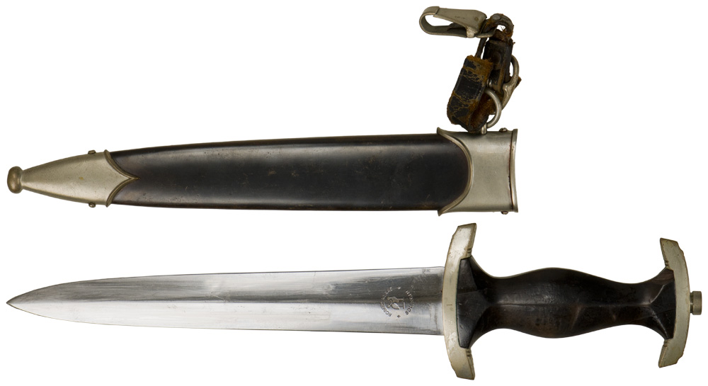 PHYSICAL DESCRIPTION: Early, (circa 1933-37), nice quality dagger features a roughly 22cm long, double edged, drop forged steel, nickel/silver plated blade with a low central ridge. The nickel/silver plated blade shows minor scabbard runners and surface spotting but is still quite clean and bright with most of the original cross graining still being visible. The obverse of the blade has a nice, deep, well defined acid etched motto, "Meine Ehre Heißt Treue", (My Honor is Loyalty). The reverse of the blade has a well defined acid etched manufacturers logo, name and location. The logo consists of two kissing swans encompassed by script, "Robert Klaas Solingen. The dagger comes with a nickel/silver cross guard, pommel and tang nut and a carved ebony grip. The reverse of the cross guard is well marked with stamped Roman numeral, "I". The nicely shaped ebony grip has a nice snug fit to the cross guard and pommel fittings. There is a chip to the top reverse grip. The grip has a flush, inset, solid nickel/silver national eagle and nickel/silver and enameled SS button nicely fit in place. The dagger comes with a black anodized, magnetic sheet metal scabbard with solid nickel/silver fittings. The solid nickel/silver top and bottom fittings both show the same light, consistently even age toned patina as on the cross guard, pommel and tang nut. The top scabbard fitting retains both of its dome headed retaining screws and the hanger suspension ring and loop. Nice untouched SS dagger. The original hanger is included, but is broken.