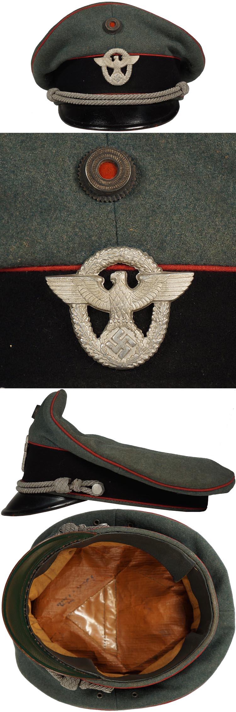 PHYSICAL DESCRIPTION: Very nice quality, private purchase, Feuerschutzpolizei, feldgrau officer’s visor cap features police green wool/rayon blend body and crown with a black velvet centerband and carmine wool truppenfarbe piping, to the crown edge and to both the top and bottom edges of the centerband. The front center of the cap has a three piece national tri-color cockade consisting of a black, fluted, alloy base, a natural aluminum roundel and an inset red felt central dot. The front center of the centerband has a stamped, polished aluminum, second pattern, police eagle encompassed by a vertically oval oak-leaf wreath. The eagle and wreath are still quite clean and bright. Cap has an interwoven, twisted silver/aluminum chin cord secured by two, small, silver washed, pebbled buttons. The cap has a black lacquered vulcanfibre visor with a raised lip to the forward edge. The interior crown of the cap is lined in orange/tan oilcloth. The interior crown lining has a partial remaining clear celluloid sweat diamond. Sweatband may be restored to the cap. Roughly a size 58. Shows the expected age and use. Scarce feldgrau example.