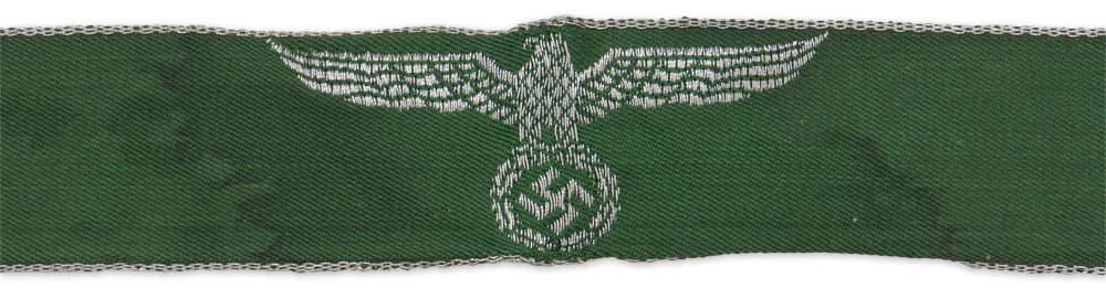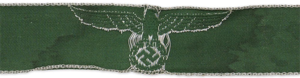 PHYSICAL DESCRIPTION: Green rayon construction cufftitle with a machine woven, stylized, national eagle, with outstretched wings, with upswept wing tips, clutching a wreathed, canted swastika in it’s talons in silvery/grey rayon threads. Both the top and bottom edges of the cufftitle are bordered in horizontally interwoven, silvery/grey rayon threads.