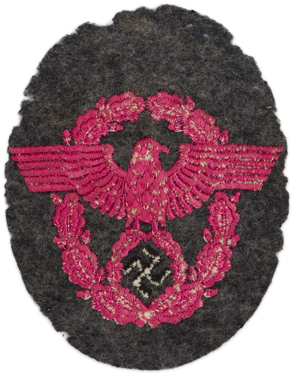 PHYSICAL DESCRIPTION: Machine embroidered police eagle encompassed by a vertically oval oak-leaf wreath in carmine truppenfarbe, (branch of service color), cotton threads with black swastika detailing, mounted on a roughly, 95mm tall and 75mm wide, vertically oval, Luftwaffe blue/grey wool base. The eagles wings extending beyond the edges of the oval oak-leaf wreath with a roughly, 70mm wingspan. The insignia shows light to moderate age and usage toning and the wool base shows some tracking. Looks to have been removed from a uniform. Scarce eagle.