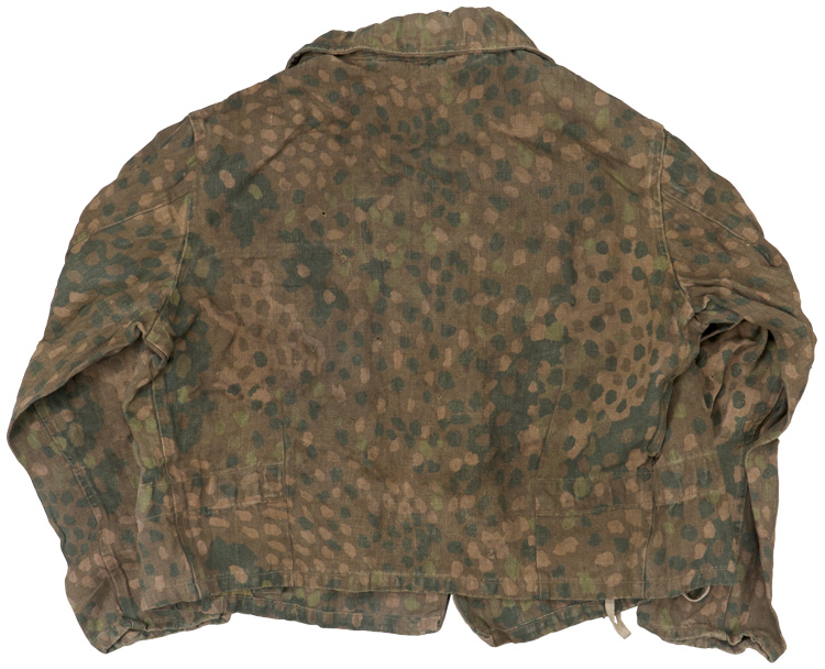 BACKGROUND: The development of SS camouflage items was initiated by Reichsführer SS Heinrich Himmler in 1935 when he tasked the Reichsführung SS, (National Leadership of the SS), to begin research of new camouflage patterns and garments for use by the fledgling SS VT, SS Verfugüngstruppe, (SS Special Purpose Troops). In late 1936 and early 1937 the first SS camouflage garments were issued to personnel of the SS VT Standarte Deutschland for field testing and evaluation. The first items evaluated were the Quarter shelters/ponchos, followed by steel helmet covers, face masks and smocks. As the war continued various other clothing items were produced in the assorted camouflage patterns. Originally the camouflage patterns were all produced in the time consuming manual screen printing until the development of the machine roller printing in 1940. By the end of the war no fewer then ten assorted camouflage patterns had been developed and used by the SS. The M44 dot pattern camouflage uniform, consisting of a field blouse and pants was officially introduced for Infantry personnel on March 1ST 1944 as a cost saving measure, and was designed to serve double duty by replacing both the drill tunic and camouflage smock. It is believed that the distinctive panzer wrap tunic and pants were also introduced and manufactured in the M44 dot pattern camouflage at about the same time as the Infantry models. The two piece M44 dot pattern camouflage uniforms for panzer personnel was intended to replace the cumbersome, panzer camouflage coveralls. Originally the early models of the M44 dot pattern camouflage uniforms were manufactured from stockpiles of dual sided, camouflage material with an HBT, (Herring Bone Twill), weave and the field blouse came outfitted with shoulder strap retaining loops and buttons and a factory applied sleeve eagle. By July 1944 the inclusion of the shoulder strap retaining loops and buttons and the factory applied sleeve eagle were discontinued. The M44 dot pattern camouflage uniform was only suitable for warm climates and regulations dictated that the uniforms were to be returned to the units storage depots annually on November 1ST although the lack of supplies negated this directive and the uniforms were worn through out the year.