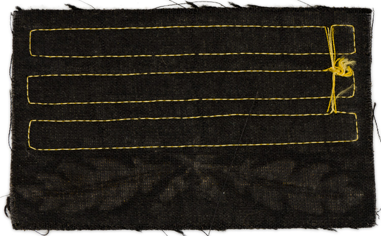 PHYSICAL DESCRIPTION: Machine embroidered insignia feature triple gold horizontal bars positioned below dual horizontal oak-leaves with two acorns, on a black wool base.