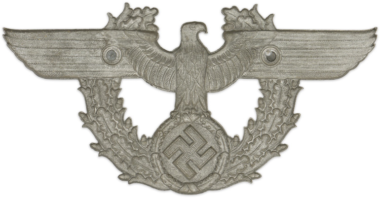 PHYSICAL DESCRIPTION: Second pattern, (Circa June 1936-May 1945), single piece, silver washed, die stamped alloy, construction, right facing eagle features out-stretched wings, clutching a wreathed, canted swastika in it’s talons and is superimposed on a vertically oval, opened top, oak-leaf wreath with the eagles wings extending beyond the outer edges of the wreath. The hollow backed reverse is a mirror image of the obverse and one remaining attachment post.