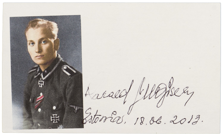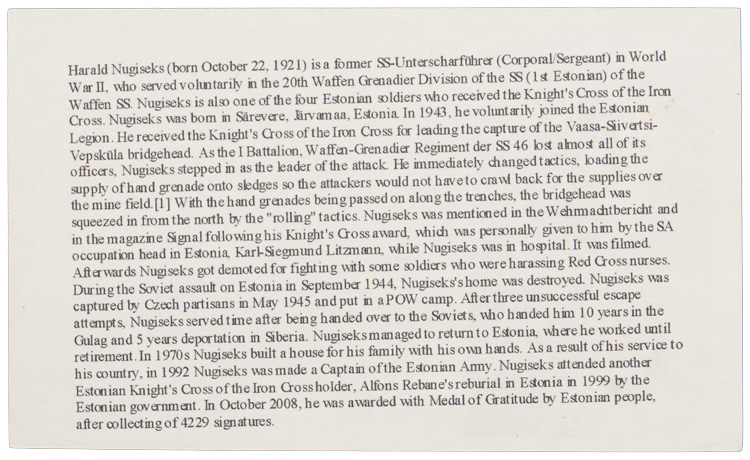 PHYSICAL DESCRIPTION: An autographed, 12.5cm x 7.5cm, light cardstock post-war photograph of Knight’s Cross winner Harald Nugiseks. The reverse of the photograph has a nice biography.