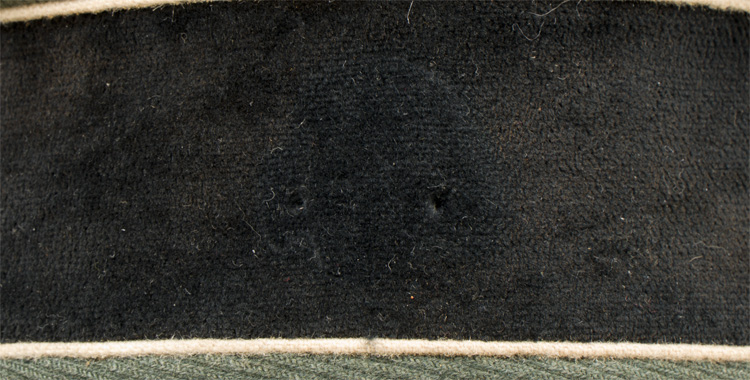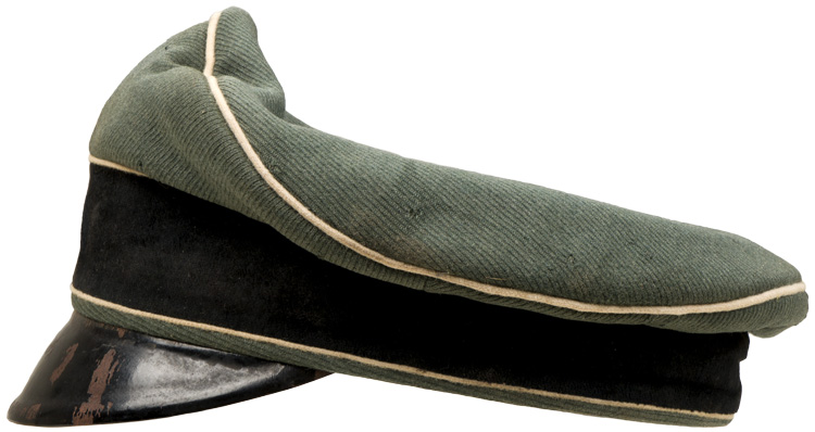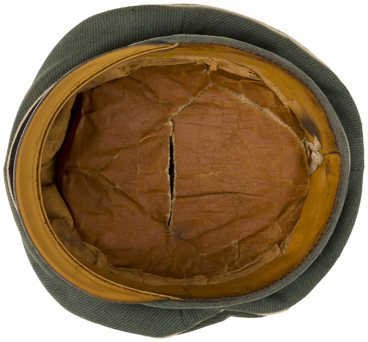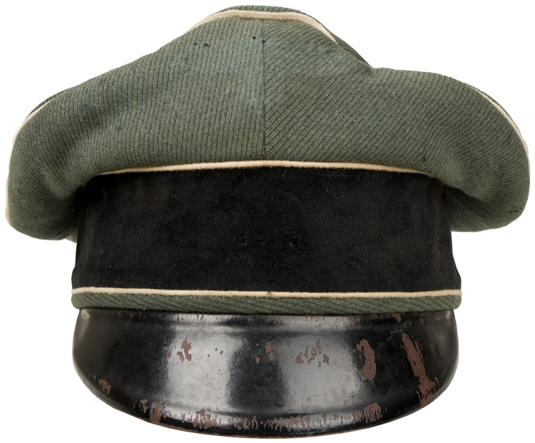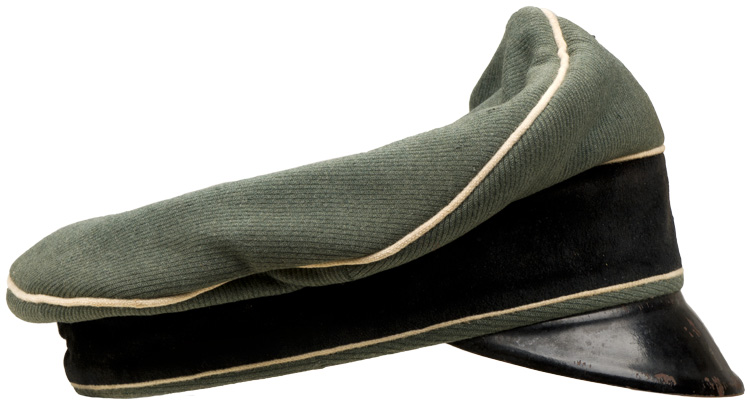 PHYSICAL DESCRIPTION: Issue type, field-grey wool/tricot blend construction, visor cap with a pronounced whipcord weave features a wide, black wool centerband and white wool piping to the top of the crown edge and both the top and bottom edges of the centerband. Cap original had a metal cap skull and cloth eagle, both of which have been removed. This one looks like it was work with-out a chinstrap, which was common during the war. The cap has a extended, forward, black lacquered, vulcanfibre visor with a subtly raised lip near the forward edge and an orangish/ tan bottom with a repeating cross-hatched pattern. The interior of the cap is fully lined with two grades of orangish/tan cloth lining. Sweat diamond is now missing. The interior of the cap also has a leather sweatband which is all complete (couple of small tears). Roughly a size 55/56. Shows the expected period use and wear but overall nice condition.