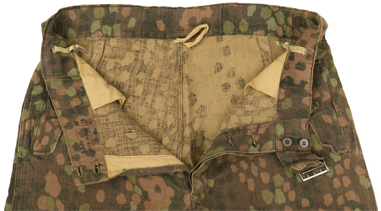 BACKGROUND: The development of SS camouflage items was initiated by Reichsführer-SS Heinrich Himmler in 1935 when he tasked the Reichsführung-SS, (National Leadership of the SS), to begin research of new camouflage patterns and garments for use by the fledgling SS-VT, SS-Verfugüngstruppe, (SS-Special Purpose Troops). In late 1936 and early 1937 the first SS camouflage garments were issued to personnel of the SS-VT Standarte Deutschland for field testing and evaluation. The first items evaluated were the Quarter shelters/ponchos, followed by steel helmet covers, face masks and smocks. As the war continued various other clothing items were produced in the assorted camouflage patterns. Originally the camouflage patterns were all produced in the time consuming manual screen printing until the development of the machine roller printing in 1940. By the end of the war no fewer then ten assorted camouflage patterns had been developed and used by the SS. The M44 dot pattern camouflage field blouse and trousers were officially introduced for Infantry personnel on March 1ST 1944 as a cost saving measure, and were designed to serve double duty by replacing both the drill uniform and camouflage smock. It is believed that the distinctive panzer wrap tunic and pants were also introduced and manufactured in the M44 dot pattern camouflage at about the same time as the Infantry models. The two piece M44 dot pattern camouflage uniforms for panzer personnel were intended to replace the cumbersome, panzer camouflage coveralls. Originally the early models of the M44 dot pattern camouflage uniforms were manufactured from stockpiles of dual sided, camouflage material with an HBT, (Herring Bone Twill), weave and the field blouse came outfitted with shoulder strap retaining loops and buttons and a factory applied sleeve eagle. By July 1944 the inclusion of the shoulder strap retaining loops and buttons and the factory applied sleeve eagle were discontinued. The M44 dot pattern camouflage uniform was only suitable for warm climates and regulations dictated that the uniforms were to be returned to the units storage depots annually on November 1ST although the lack of supplies negated this directive and the uniforms were worn through-out the year. Of Note: The panzer personnel M44 dot pattern camouflage pants differed slightly from the cut of the M44 drill uniform pants. The main differences include the addition of pocket flaps and an integral belt and the lack of belt loops.