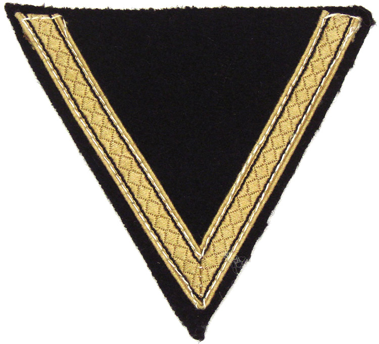 PHYSICAL DESCRIPTION: The insignia consists of a single, "V" shaped, machine woven, diamond patterned, tress chevron, in subdued, golden/tan rayon with interwoven, fine, black stripes, near both the inner and outer edges, machine stitched on a black wool base, which tapers down to a pointed tip.