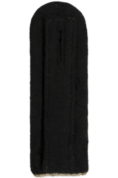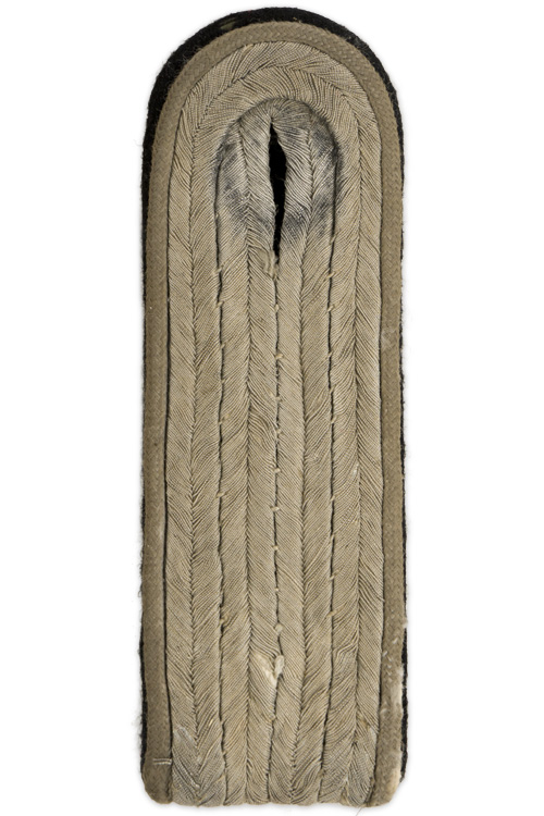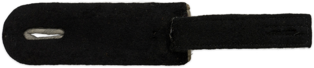 PHYSICAL DESCRIPTION: Slip on shoulder board of subdued silver/aluminum Russian braid, with white rayon waffenfarbe on a black wool base. Looks like it had a rank pip removed. The shoulder board represents the rank of SS-Untersturmführer serving in a Infantry unit.