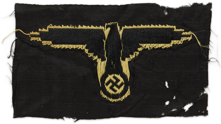 PHYSICAL DESCRIPTION: Second pattern, (Circa 1942 1945), machine woven, tropical SS sleeve eagle with out stretched wings, clutching a wreathed, canted, swastika in its talons in golden/tan rayon threads on a woven, black, rayon base.