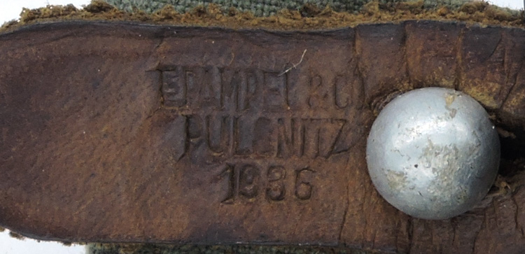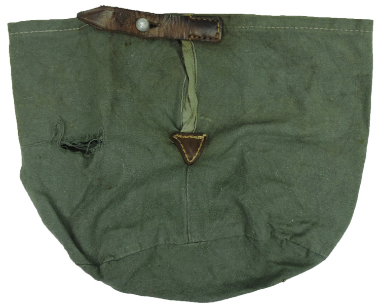 PHYSICAL DESCRIPTION: Light weight canvas construction M31 mess kit cover with leather and steel fittings. The front center of the cover has a small, vertical, inverted "V" slash and an inverted triangular leather reinforcement panel at its bottom edge. The opened, top edge of the inverted "V" slash has a horizontal leather closure strap to the right side with a corresponding closure stud to the left side. Removed from a back pack. Several tears.
