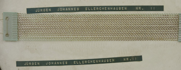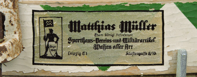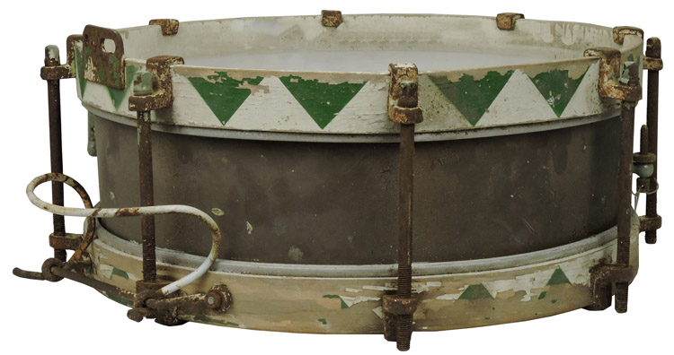 A WW2 Polzei/SS snare drum with green and white painted triangular pattern, has a 38cm diameter, with modern skins and chains. The skins are separated by a 16cm tall brass surround with upper and lower wooden bands. Eight right-angle metal brackets are equidistantly riveted along both the upper and lower bands, with threaded metal posts fed between them. The top of these posts are square in shape and control the tightening of both the upper and lower skins. To the upper wooden band is a sticker for "Matthia Muller", while the bottom drum skin has a pair of labels that possibly identify the previous owner. Original leg brace is intact.