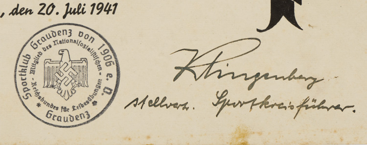 A 21cm x 30cm, single sided award document that reads in part "DISTRICT GROUP GYMNASTICS AND SPORTS FESTIVAL, 5TH WINNER, MEN'S TRIATHLON, CLASS 1, ERICH FREYER, POLICE SPORTS COMMUNITY GRAUDENZ WITH 1479 POINTS". The document is dated for July 20, 1941 with appropriate signature and office stamp.