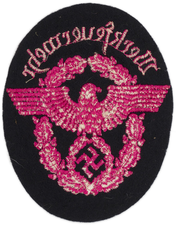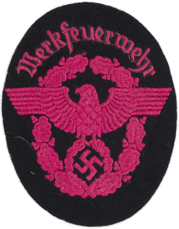 PHYSICAL DESCRIPTION: Machine embroidered, police eagle with out-stretched wings, clutching a wreathed, canted swastika in it’s talons, encompassed by a vertically oval, oak-leaf wreath, positioned below the Gothic scripted designation, "Werkfeuerwehr", (Industrial Fire Brigade), all in carmine cotton truppenfarbe, (Branch of service color), threads, mounted on a vertically oval, dark, navy blue wool base. Scarce Werkfeuerwehr sleeve eagle.