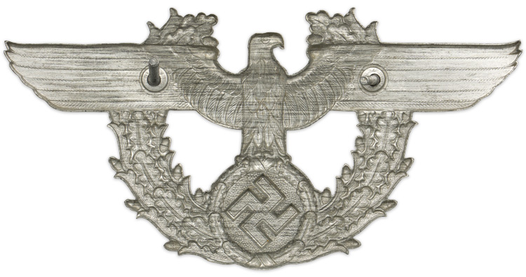 PHYSICAL DESCRIPTION: Second pattern, (Circa June 1936-May 1945), single piece, silver washed, die stamped alloy, construction, right facing eagle features out-stretched wings, clutching a wreathed, canted swastika in it’s talons and is superimposed on a vertically oval, opened top, oak-leaf wreath with the eagles wings extending beyond the outer edges of the wreath. The hollow backed reverse is a mirror image of the obverse and has both inset, soldered, screw threaded attachment prongs.
