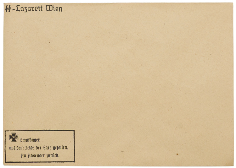 A 12cm x 16cm empty, un-used envelope that has stamped to the upper left "SS-Lazarett Wien" which was a hospital in Prague. The bottom left corner reads "Empfänger auf dem felde der ehre gefallen. An Absender zurück." or "Recipient Fell on the Field of Honour. Return to Sender".