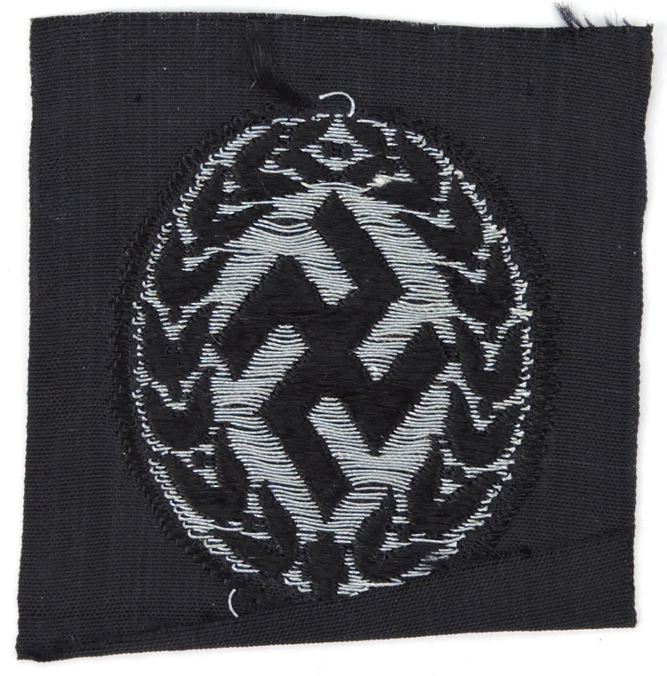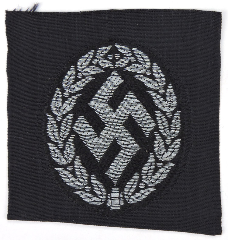 PHYSICAL DESCRIPTION: The machine woven insignia consists of a vertically angular, canted swastika encompassed by a vertically oval, laurel leaf wreath in silver/grey rayon threads, mounted on a vertically oval, woven, black rayon base. The insignia is still on it’s original black rayon factory roll and is in overall excellent, unissued condition.