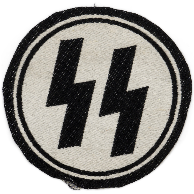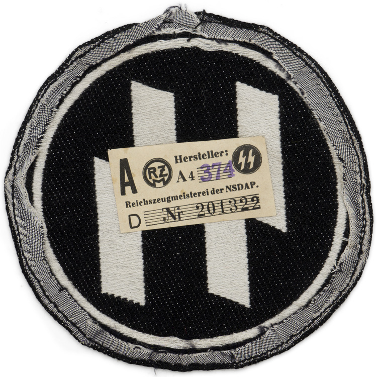 PHYSICAL DESCRIPTION: The insignia consists of a roughly, 105mm diameter, machine woven, white rayon base with a black/white/black trimmed outer border encompassing a white field with central, interwoven, black, SS runes. Complete with original RZM tag. Nice!