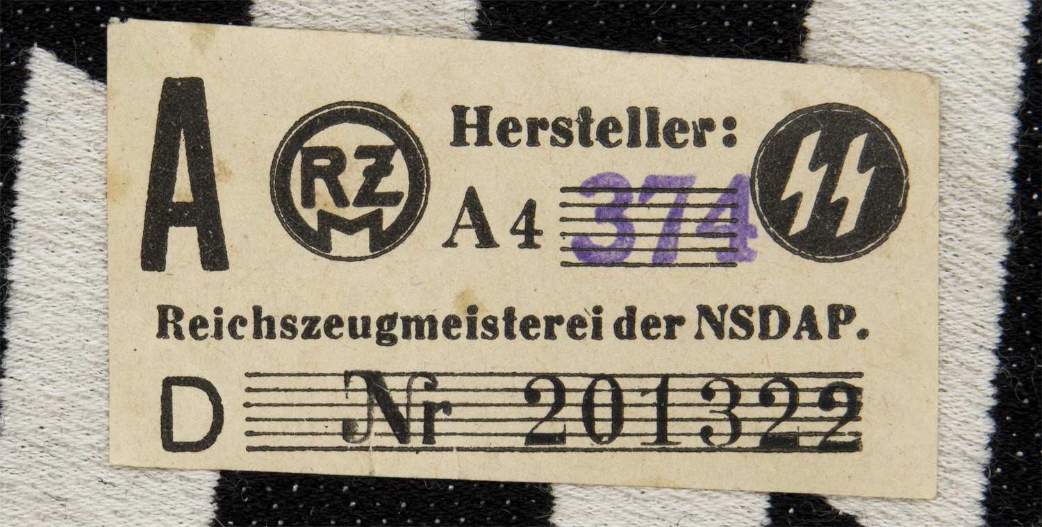 BACKGROUND: Reichsführer SS Heinrich Himmler’s obsession with pagan runic symbolism manifested itself in runic emblems used by the SS, Schutz Staffel, (Protection Squad), the most famous of which was the dual sig runes used on the collar tabs, helmets decals and sports shirts of the SS. The dual sig runes design was initiated by SS Sturmhauptführer and graphic artist Walter Heck in May 1933, who sold his design to the SS for 2.50 Reichs Marks. Physical fitness of its personnel was a prime concern of the SS and prior to the war each new recruit was issued a basic sport uniform that consisted of black short pants and athletic shoes and a white pullover "tank top" style shirt with the runic SS emblem on the front center plus an additional track suit consisting long pants and a long sleeve shirt. The basic regional organizational infrastructure of the Allgemeine SS, (General SS), began with the SS Oberabschnitte, (SS Districts), which corresponded roughly to the German Armed Forces, Wehrkreis, (Military District), and each SS Oberabschnitte contained a Sportabteilung, (Sports Detachment), which was tasked with all aspects of physical fitness and sports training. Of Note: The SS sports uniform was based on the army’s sports uniform and was officially adopted by regulations in May 1934 but in likelihood it had been introduced prior to that date. Originally the insignia utilized on the sports shirt consists of white SS runes on a black base field but the coloration of the insignia was soon reverse to black SS runes on a white base field. The issue of the sports uniform was discontinued sometime early in the war, circa mid 1941. Also Of Note: The RZM, Reichzeugmeisterei, (National Equipment Quartermaster), was officially founded in June 1934 in Munich by the NSDAP Nationalsozialistische Deutsche Arbeiterpartei, (National Socialist German Worker’s Party), as a Reich Hauptamt, (State Central Office), and was based on the earlier SA, Sturm Abteilung, (Storm/Assault Detachment), Quartermaster’s Department. The functions of the RZM were not only to procure and distribute items to Party formations, but also to approve chosen designs and to act as a quality control supervisor to ensure items manufactured for the Party met required specification and were standardized. Starting in late 1934 items manufactured for the SS came under the quality control of the RZM and were marked with a RZM/SS approval/acceptance tags. In 1943 the Waffen SS assumed full control over their uniform item production and no longer fell under the authority of the RZM.