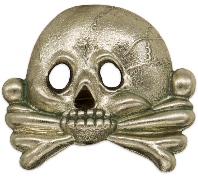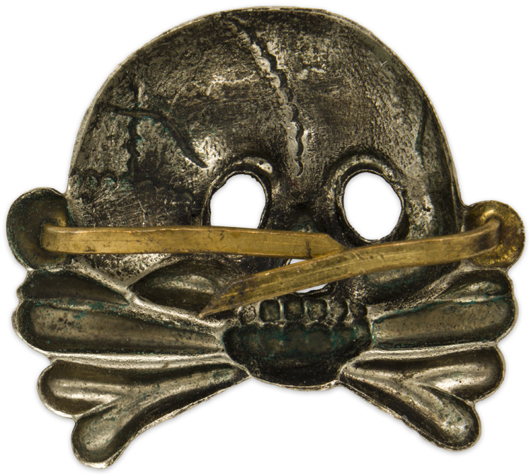 PHYSICAL DESCRIPTION: First pattern, (Circa 1923-1934), silver washed, stamped alloy construction Imperial Prussian Danziger style skull, with no bottom jaw, superimposed over crossed bones. The skull features two rows of teeth, oval eye cut-outs, a triangular nose cut-out and embossed cranium detailing. The hollow backed reverse is a mirror image of the obverse and both original prongs are intact.