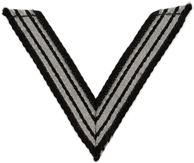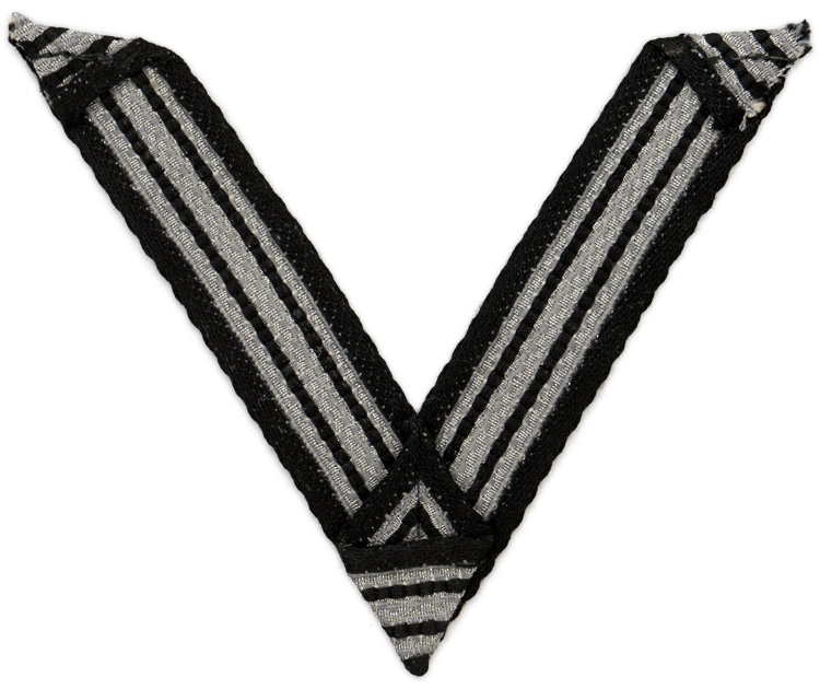 PHYSICAL DESCRIPTION: The insignia consists of a single machine woven, matte silver/grey, waffle patterned, rayon chevron with two interwoven, narrow, parallel black stripes situated near the inside and outside edges. The chevron has black rayon edging with an diagonal pattern.