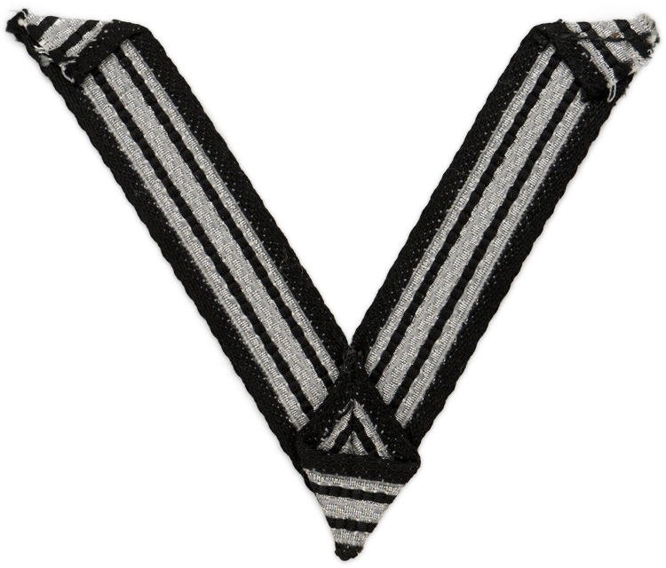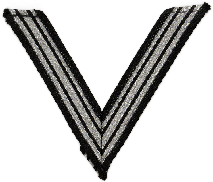 PHYSICAL DESCRIPTION: The insignia consists of a single machine woven, matte silver/grey, waffle patterned, rayon chevron with two interwoven, narrow, parallel black stripes situated near the inside and outside edges. The chevron has black rayon edging with an diagonal pattern.
