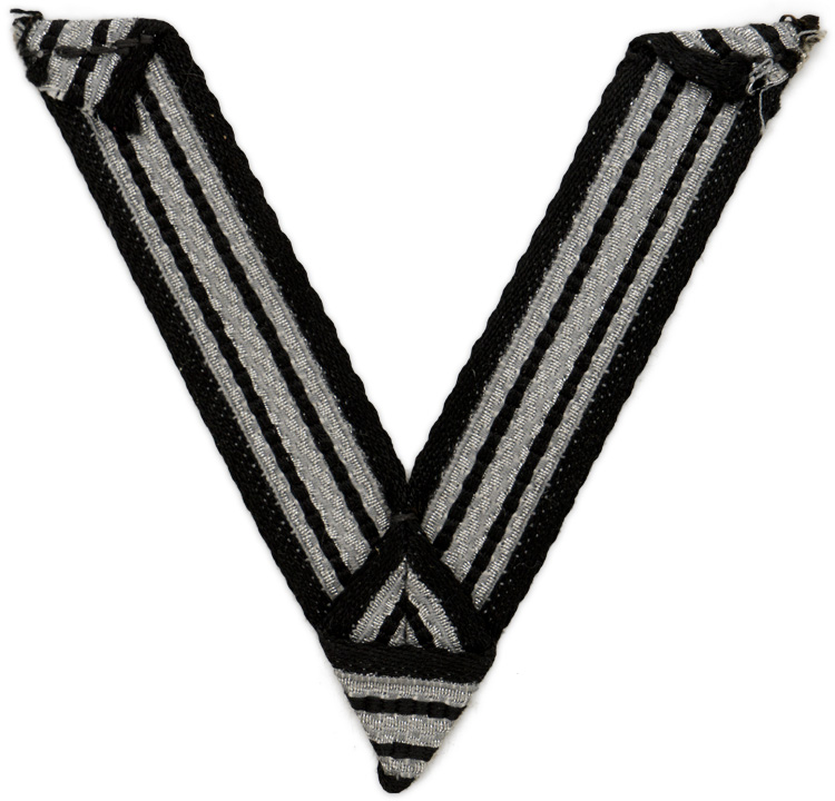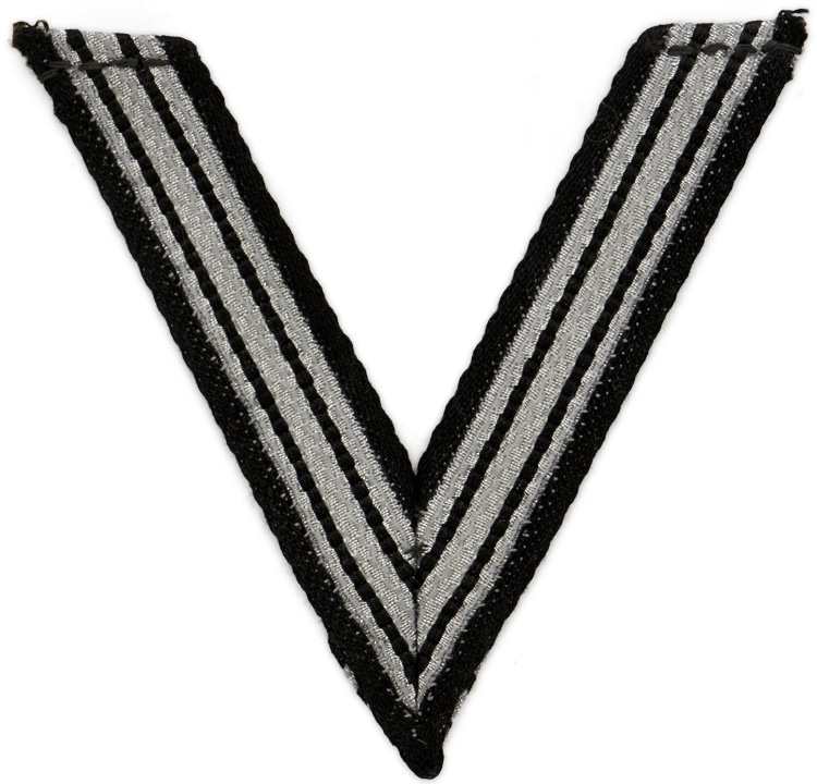 PHYSICAL DESCRIPTION: The insignia consists of a single machine woven, matte silver/grey, waffle patterned, rayon chevron with two interwoven, narrow, parallel black stripes situated near the inside and outside edges. The chevron has black rayon edging with an diagonal pattern.