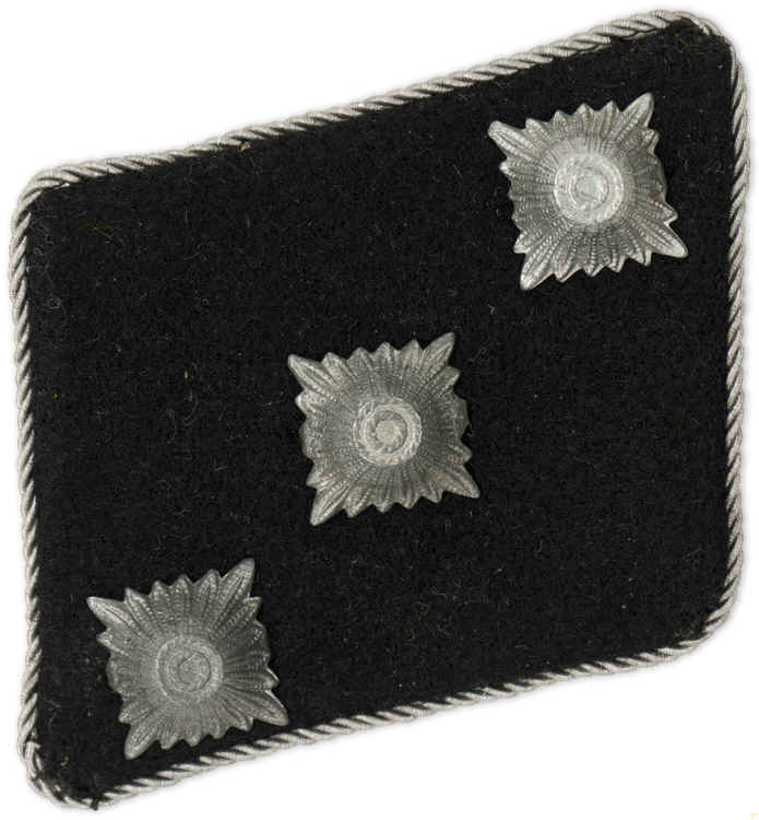 PHYSICAL DESCRIPTION: Third and final pattern, (Circa August 1940 to May 1945), silver wire piped, black wool construction, left hand side, rank collar tab with three stamped rank pips. Nice clean example.