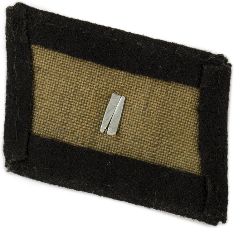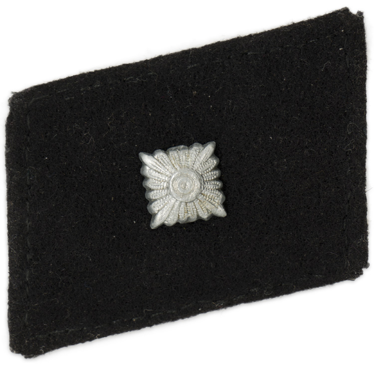 PHYSICAL DESCRIPTION: Third and final pattern, (Circa August 1940 to May 1945), un-piped, black wool construction, left hand side, rank collar tab with a single rank pip positioned on the center. The collar tab is mounted on a tan buckram backing. The collar tab indicates the Waffen-SS rank of SS-Unterscharführer. Uniform removed.