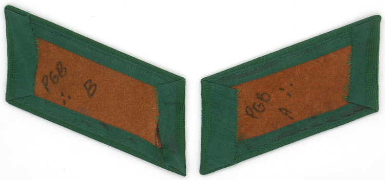 PHYSICAL DESCRIPTION: The 1937 pattern, machine woven, bottle green rayon, construction collar tabs with a machine woven, saw-toothed, outer edge border in matte silver/aluminum flat-wire threads. The collar tabs are mounted on cardstock backings.