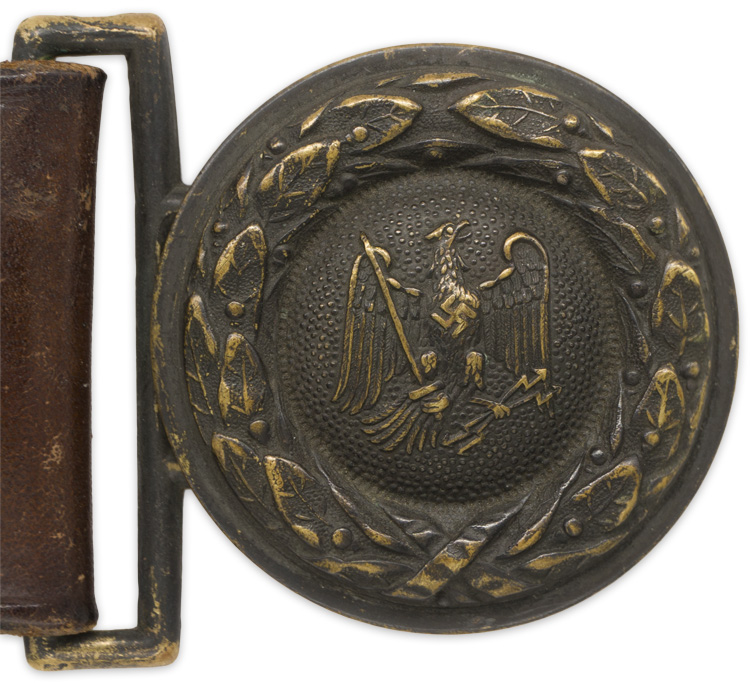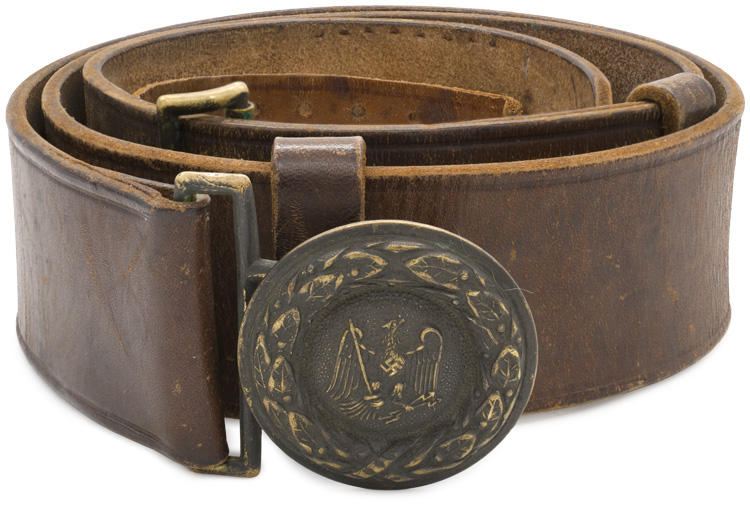 PHYSICAL DESCRIPTION: Roughly 48mm round, stamped, belt buckle features the 1933 pattern Prussian insignia. Reverse of buckle is a mirror image of obverse. Retaining hook secures the open rectangular bar. Unmarked example. Buckle comes complete with a brown leather belt with a leather retaining tongue and vertical sliding leather keepers, both intact. Leather is 104 cm in length. Nice set.